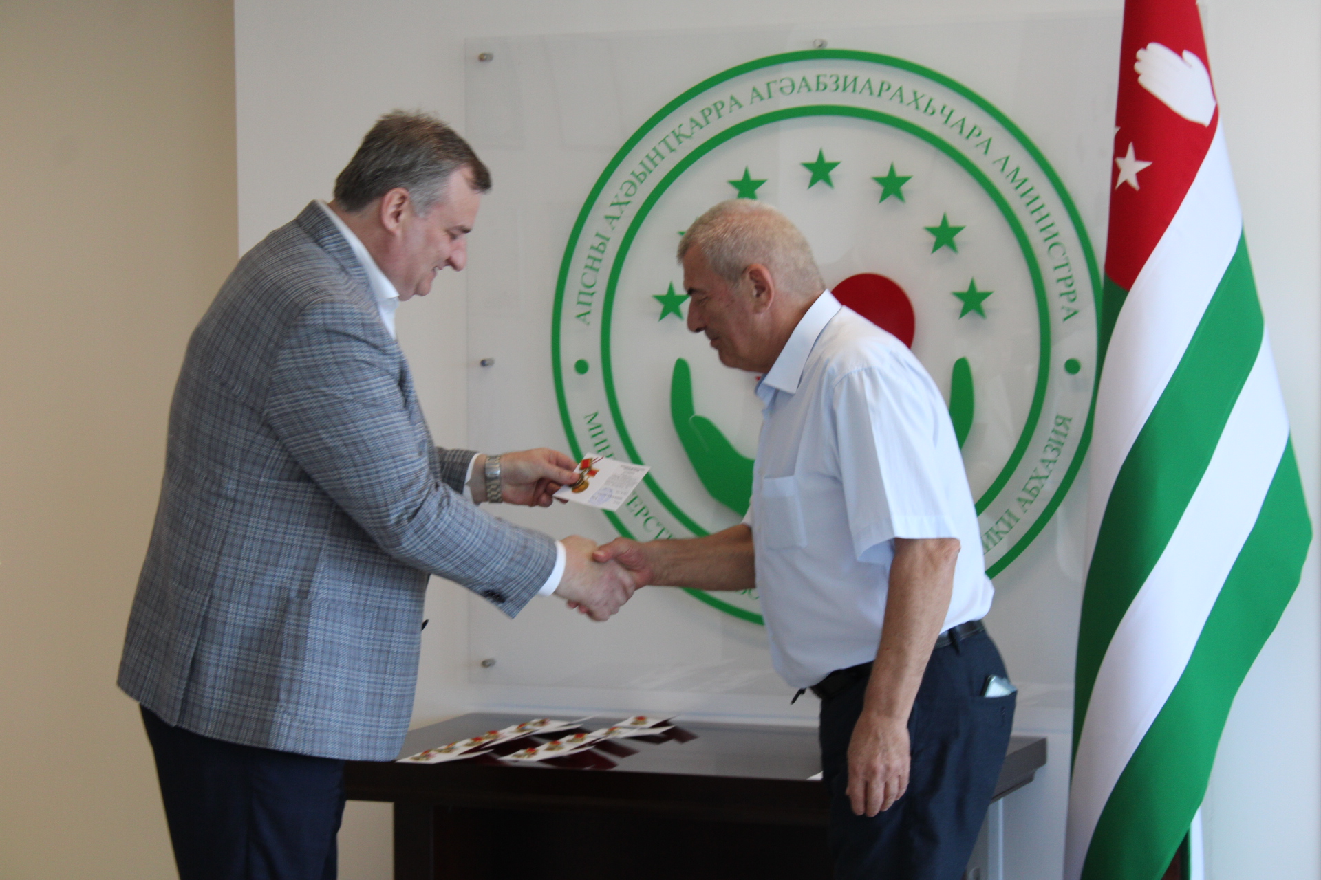 Герой Абхазии Аполлон Гургулия от лица собравшихся вручил Министру здравоохранения Эдуарду Бутба юбилейную медаль.
